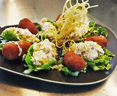 Toasted bread with crispy fried fish, steamed fish, prawns, caviar and dressing
