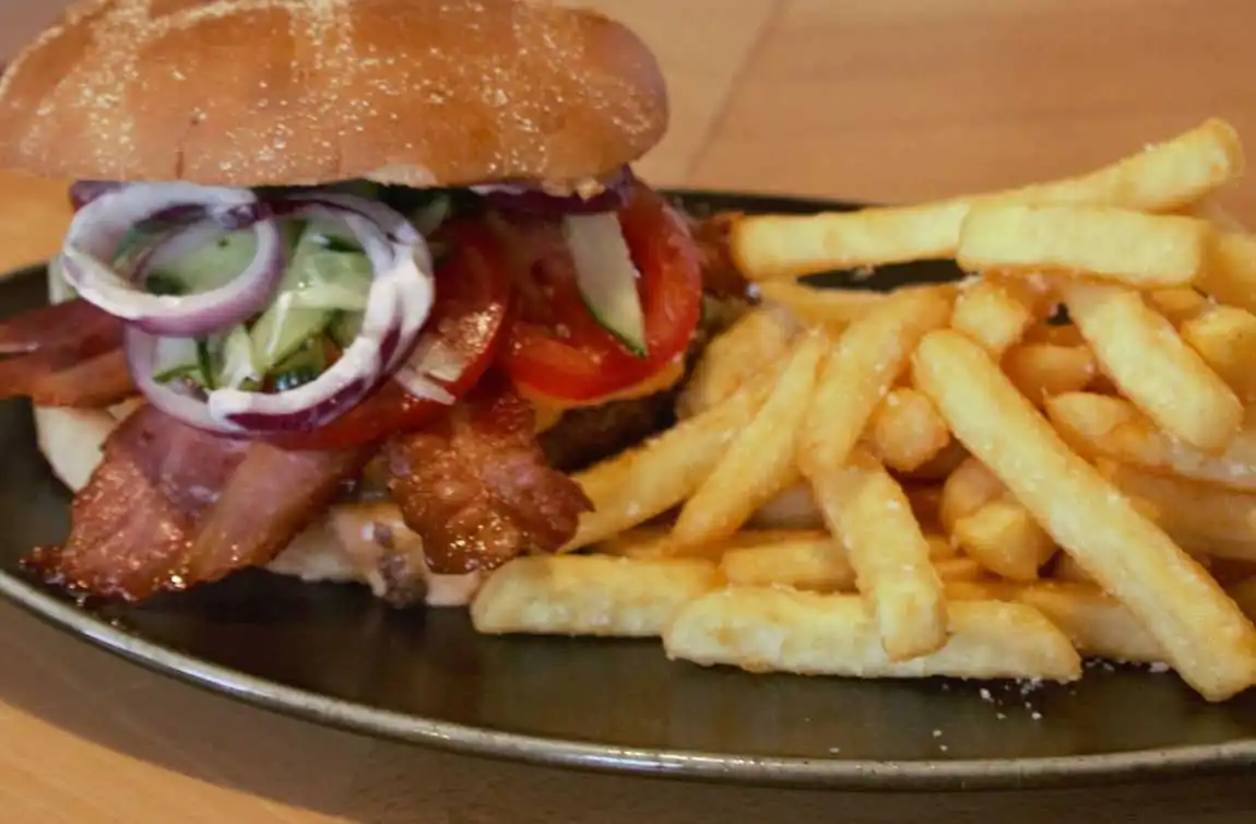 With salad, cheddar, bacon and a twist of chilli. Served with french fries